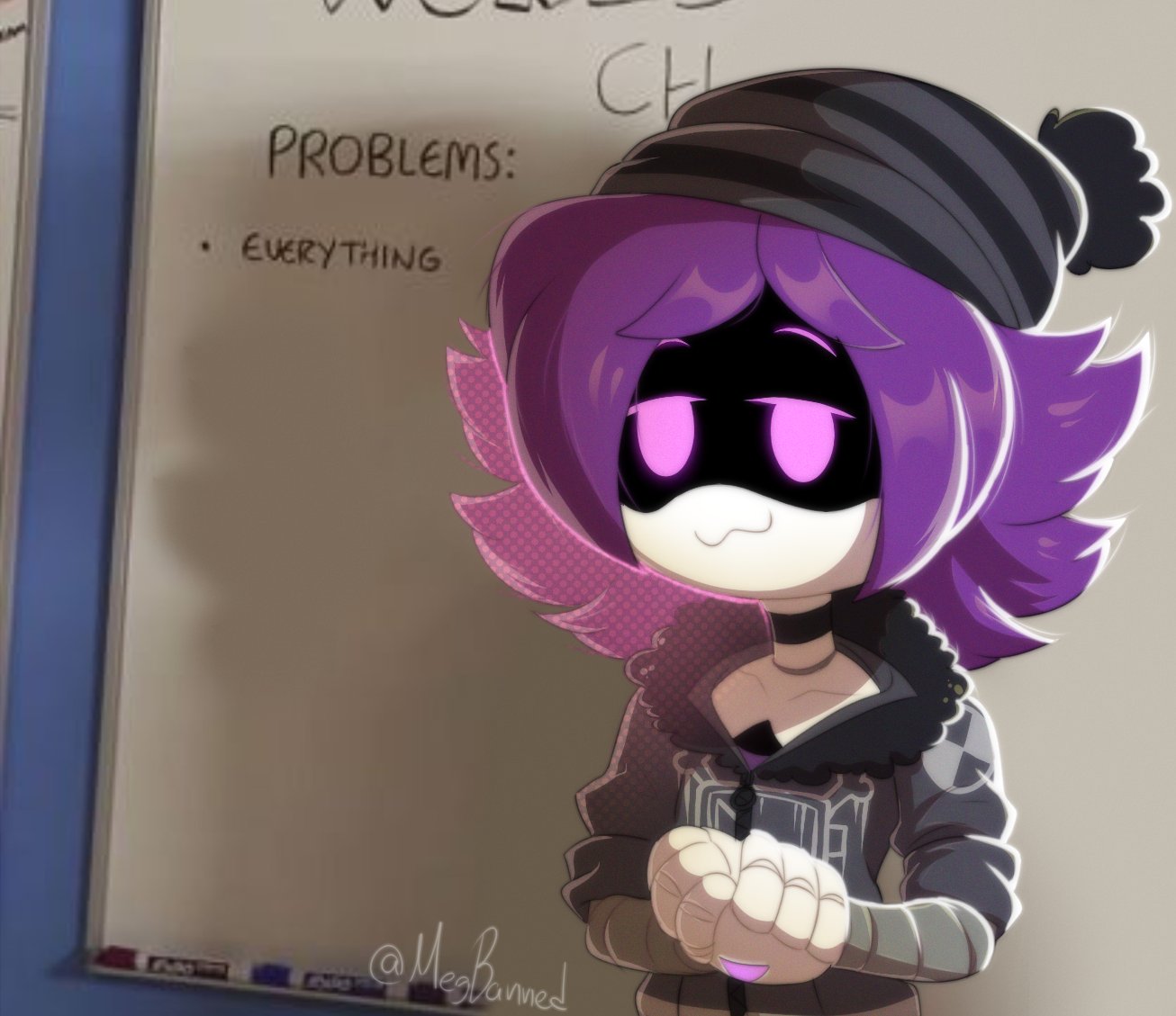 this is Uzi Doorman. from Murder Drones. A lovely little web show about cute robots who murder each other for reasons. Uzi is a edgy, rebellious teen who is bad at socializing and generally self-concious about things. She was also inhabited by an eldritch AI bent on destroying what's left of humanity and gifting her various super powers.